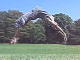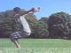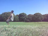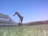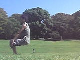 E膝を前に出さないことによって後方への踏み切りは有効に行なわれます。跳ぶ方向は上ではなく後方です。指導者によってはこれを守らせるために、わざと頭を前屈させてC〜Fの練習をさせる方もいます。 | ![]() |