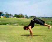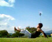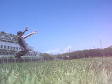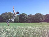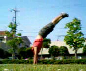 O跳びました。手も足も地面から浮いて、エビが逃げるときの格好になります。これがあふりです。このあふりが、バク転で最も重要です。あふりがあることによって、連続でバク転したり、宙返りにつなげたりすることができるのです。 |