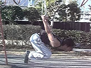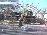 | 雲梯(うんてい)にて行いました。撮影の便宜上、雲梯を使っているだけです。鉄棒にオリジナル吊り輪をセットして行うのと、やり方は同じです。 |