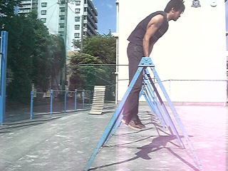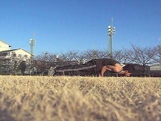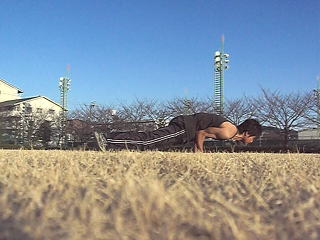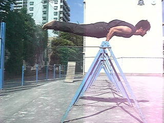 バランスジーズ、というカッコいい名前がついてますが、いわゆるワニ逆立ちです。一般には鉄棒で行うことが多いストリートワークアウトの技です。