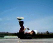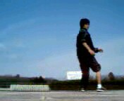 E勢いを利用し、両足が 浮きあがります。左手で 体重を支えてから、右手は 滑らせるようにして崩して 地面につけていきます。 |