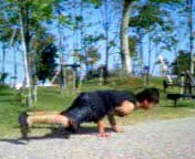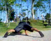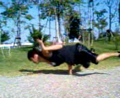 | @管理人の回転は時計回りです。反時計回りの方はこのページの言葉を反対にとらえてくださいな♪回転時の軸手になる右手を逆手に、左手は順手で地面に手をつけます。 |