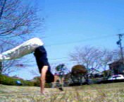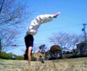 G倒立の姿勢を作って いきます。(無理に倒立の 姿勢で止める必要は ありません。とにかく 背中を地面に打ちつけ ないことが最重要ポイント です。) |