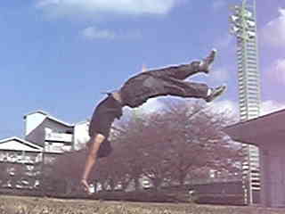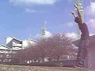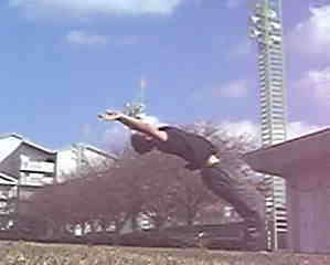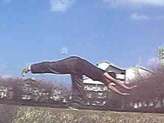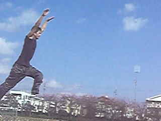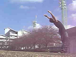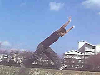 H跳んでいます。 跳ぶ方向、つまり突き手で 突き放す方向は、真上です。 垂直に跳びます。 前方ではありません。 |