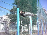 | @鉄棒にぶら下がる前。本人は羽生結弦クンを意識していますが、誰も気づきません。 |