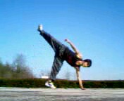 B足も振り上げます。ここまで側転と 同じ動き。 |