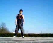 C顔は横向き。(カメラ目線を意識 してるわけではないのですが、 そんな感じで。) 腰を置いてきぼりにして足を 振り上げます。 |