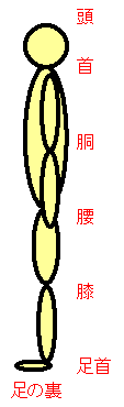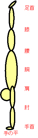 下からの積み上げです。手の上に肘、肘の上に肩、肩の上に腰、腰の上に膝、と